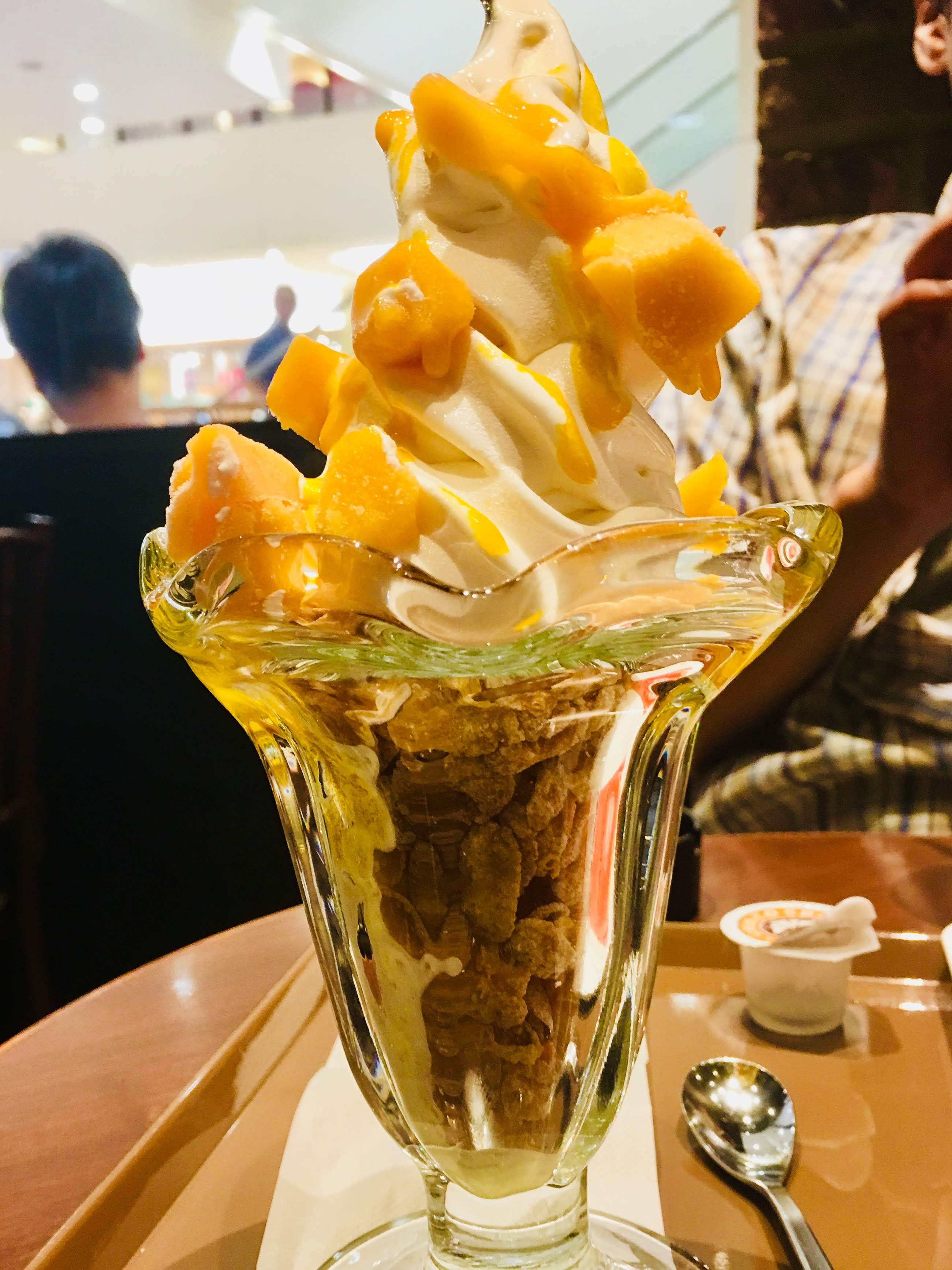 サンマルクカフェのマンゴーパフェも美味しい。下がコーンフレークやってのに気付いたので、アイスを残して溶かしながら食べました(;´д`)